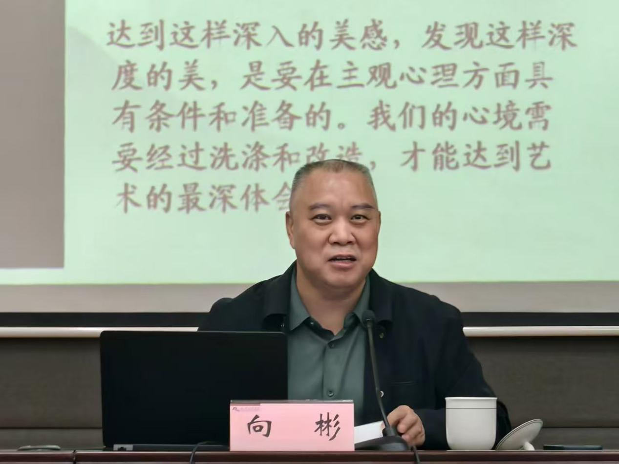 讲座中,向彬首先阐释美感定义与诗境内涵,指出美感是一种体验,而诗境常被现实中的功利追求所掩盖;他强调深度审美需摒弃功利杂念,注重转换视角、开阔心境。此外,向彬以晋人情怀为切入点,介绍了中国文化“由实入虚,即实即虚”的审美特点,并提出本次讲座的核心命题——“以物观心”、“以我观心”以及“以心观心”三种审美境界论。整场讲座让在场师生受益匪浅。