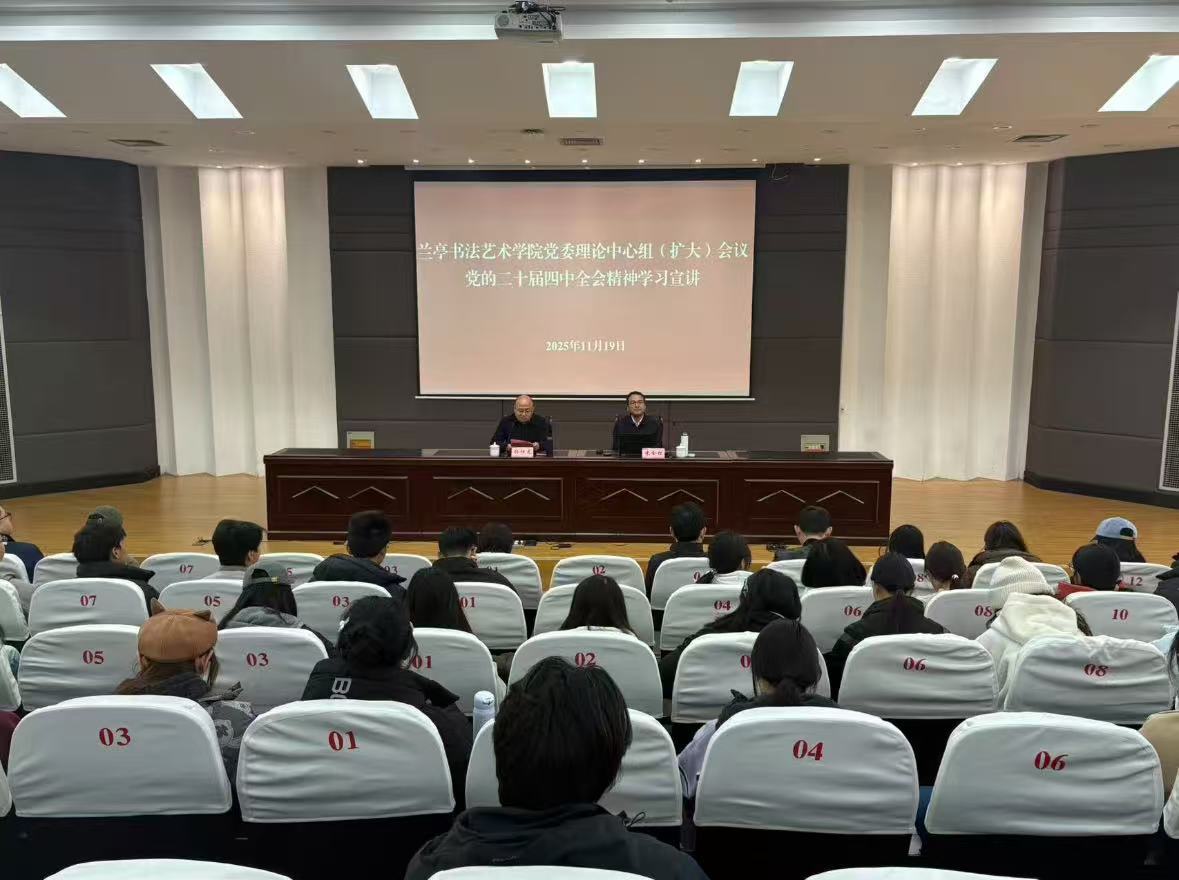 2025年11月19日,在兰亭校区举行“时政大讲堂”兰亭书法艺术学院党委理论中心组(扩大)会议,专题学习党的二十届四中全会精神。会议邀请绍兴市党史办公室主任朱全红作专题宣讲报告,旨在引导全院师生深入领会全会精神,统一思想行动,凝聚发展共识,汇聚推动学院高质量发展的强大合力。讲座由学院党委书记孙仕龙主持,学院师生代表约150人参加学习。