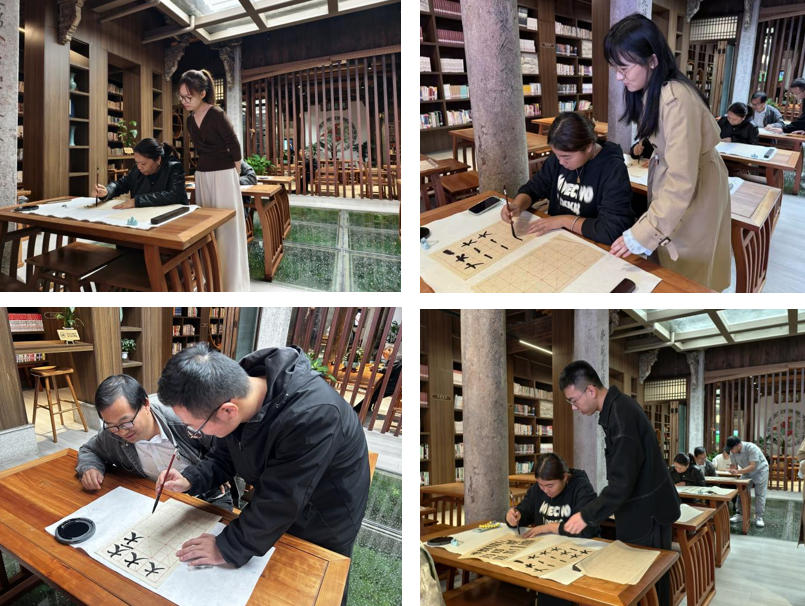 10月30日上午,活动在明善书院继续进行。凌天明博士为松阳县实验小学的教师们讲解汉字结构特点与书写要领,并组织大家亲身体验毛笔书法。在凌博士与研究生的现场指导下,参训教师认真练习,逐步掌握字形结构与用笔方法。凌博士通过亲身示范,完整展示从起笔到收笔的书写过程,帮助教师在实践过程中领略书法艺术的魅力。活动尾声,参训教师独立完成以“大美松阳”为主题的书法作品,现场气氛热烈。